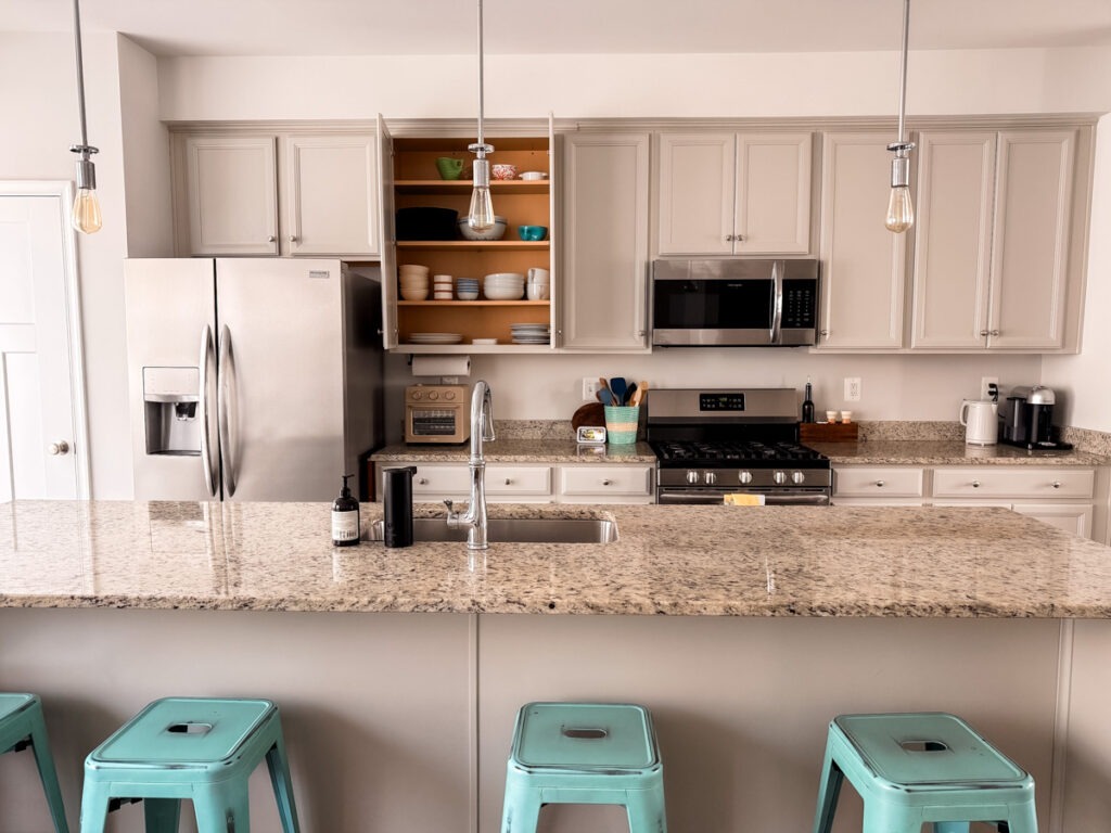 Many of the kitchen’s I’ve lived in have been modest. My first rental kitchen in Cville was IKEA and the cupboards have been so excessive. We additionally didn’t have a pantry. My second Charlottesville home had extra ground house, but it surely was not a big kitchen and likewise didn’t have a pantry. After all, the kitchen I renovated in 2023 was wonderful and big and I miss it a lot. And now in the townhouse, I’m as soon as once more determining the best way to profit from a kitchen with fairly normal storage. It’s loopy how briskly you may refill cupboards!